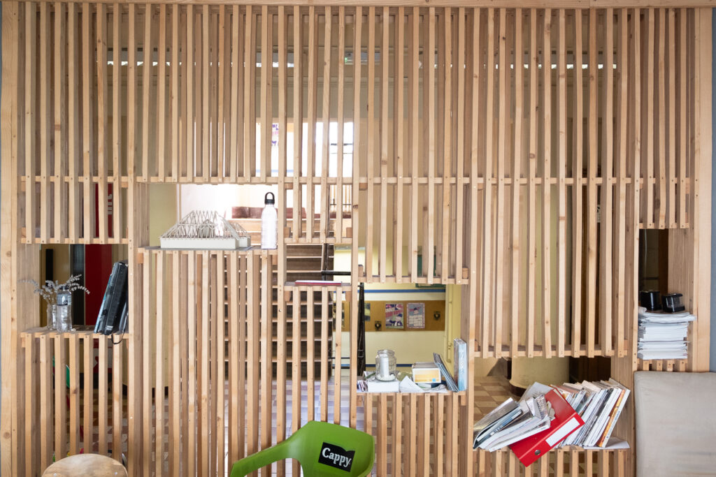 During the 1988 renovation, the dining hall and gym were converted into a concert venue. Beneath the cultural hall was a kitchen facility capable of serving multiple dormitories, with a capacity of 1,000 people. The renovation plans from 1988 also reveal changes to the basement functions of the two-story building. In the former kitchen area, an exhibition space was later established, along with two club rooms and two workshop rooms designed by Katalin Gergely (UVATERV). All of these rooms featured stone cladding and suspended ceilings.