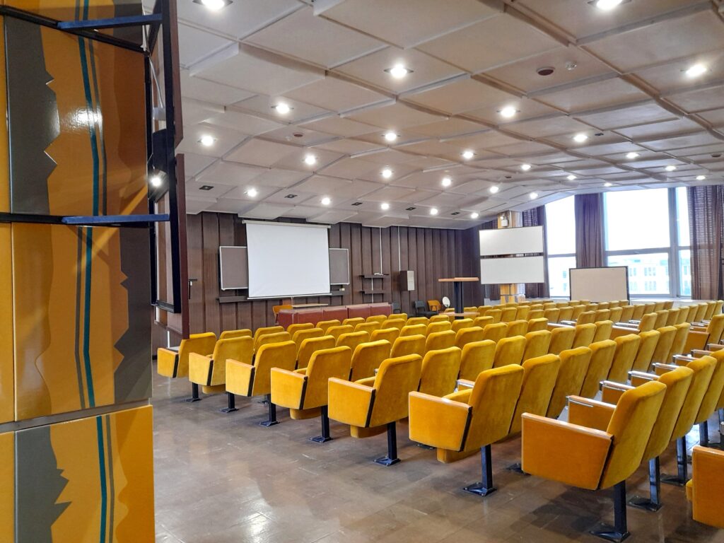 Az első emeleten kapott helyet a könyvtár, a büfé, illetve a társalgó, míg a második emeleten a könyvtár felső szintje és a 150 személyes előadóterem, ahol szinkrontolmácsolásra is volt lehetőség.[6] Ezek belső kialakítása mind egyedi. A A remek akusztikájú, mai szemmel már időkapszulának is beillő előadótermet kétoldalt kettő-kettő geometrikus díszítésű, színeiben a sárga üléshuzatokkal harmonizáló zománcozott fém bevonatú négyzetes oszlop díszíti, motívumai a kétszárnyú bejárati ajtók fogólapjain megismétlődnek. A jó akusztikát és egyben a tudományos prezentációt is szolgáló rögzített bemutató panelek egyikén kis fém táblán ez áll: „A terem belsőépítészeti, akusztikai és világítástechnikai kialakítását az MTA – AKL tervei alapján a Kelet-Pesti ÁFÉSZ VERTIKSZOLG szakcsoportja végezte 1985-ben.” Ezek szerint az időkapszula a ’80-as évek közepéről maradt ránk.