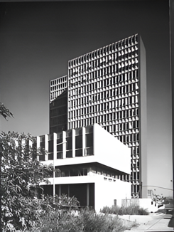 A Magyar Tudományos Akadémia öt egységének közös otthonaként 1975-ben készült el a 15 szintes, laboratóriumokat és kutatószobákat tartalmazó toronyépület. A második ütemben pedig a Bonc utca felőli négyszintes szolgáltató tömb, amelyben a mai szemmel már időkapszulának is beillő előadó, és az ország akusztikai kutatásokra tervezett első süketszobája található. A toronyépületet az építész, Tóth Dezsőné Schilling Erzsébet terveinek megfelelően összesen 1006 darab egyedi vasbeton panel burkolja.