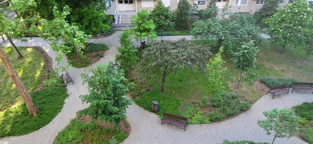Az épületek melletti játszóteret és a köztes parkot lakossági egyeztetés után újította fel a kerületi önkormányzat 2019-ben. A zöldfelületek növelését a korábbi szilárd burkolatok csökkentésével érték el: a korábbi 690 m2 helyett annak felén történik a gyalogosforgalom; az eredeti egyenes, merőleges betonfelületek helyett lágyabb, íves, térkőburkolatos felületen. A megnövekedett zöldfelületre 31 féle, összesen 3600, túlnyomórészt virágzó évelőket és talajtakaró cserjéket ültettek. Az átalakítás során fát nem vágtak ki: természetesen a helyén maradt a több mint ötvenéves platánfa, amely már a ’78-as beköltözésnek is tanúja volt, a kisebb vadalmafák is, a 13 újonnan ültetett fiatal faegyed pedig várostűrő és nincs jelentős kártevője. A Faludi utca 6/a épület mellett a korábban is kutyafuttatásra használt területet elkerítették és szabályossá alakították.[1]