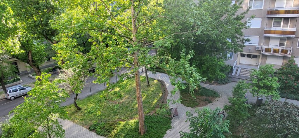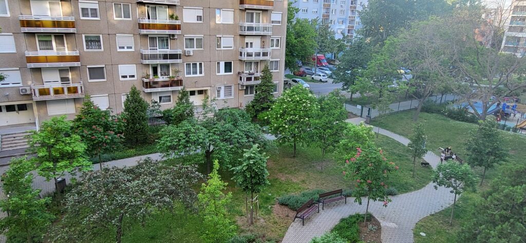 A két épület között elhelyezkedő hangulatos, zöld parkra néz valamennyi lakó ablaka, erkélye, illetve mind a négy lépcsőház főbejárata is erről az oldalról nyílik. A hátsó bejáratok a parkoló felől nyílnak.