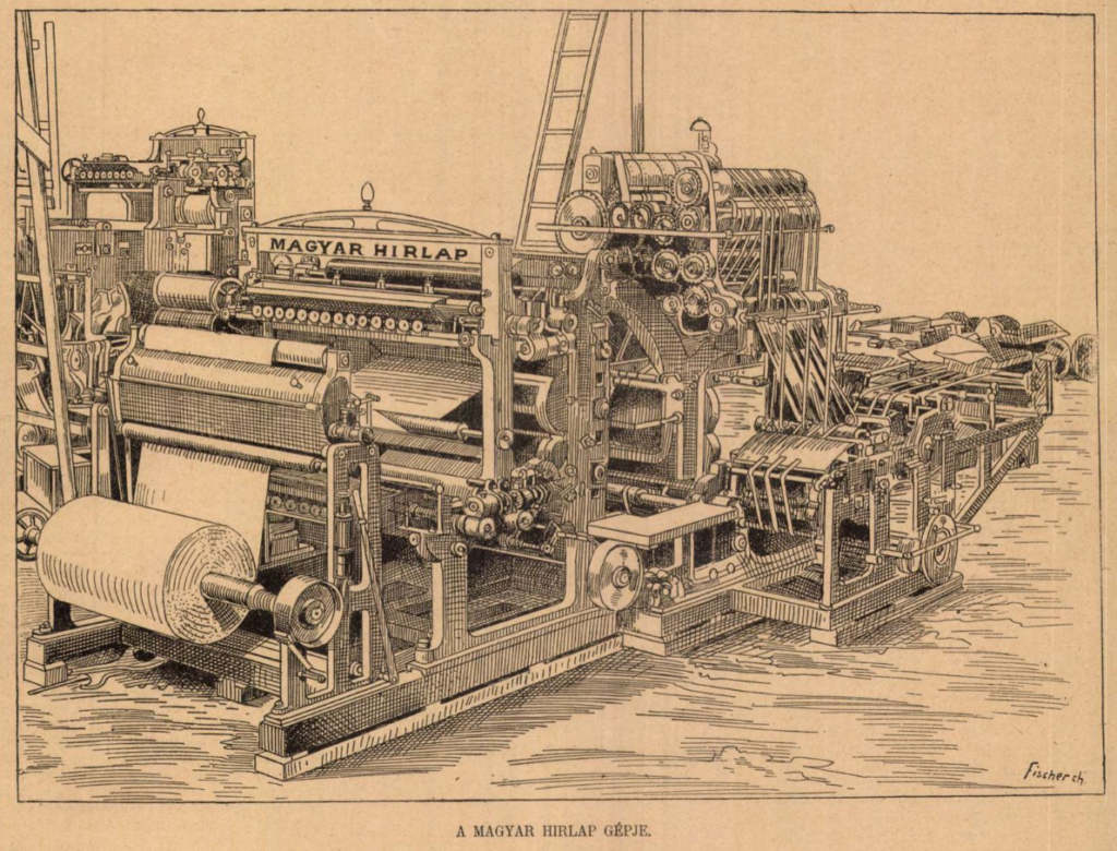 1892-től itt működött a Magyar Hírlap szerkesztősége és nyomdahivatala, amelyről számos – mai szóval élve – PR-cikk jelent meg, főként az Ország-Világ című magazinban, amelyek a ház dicséretét sem nélkülözték. Az egyik legnagyobb szenzáció azonban a nyomdagép volt: ”Szédítő gyorsasággal halad a nyomdaipar. Alig pár évtizeddel ezelőtt még az emberi kéz végezte a nyomási munkákat s akkor még senki meg sem merte volna álmodni, hogy egy lapnak egyszerre mindkét oldala nyomódjék és hogy az rendesen összehajtogatva, felvágva kerüljön ki valamely csodamasinából. Legújabban a Magyar Hírlapaz, mely egy ilyen új kolosszusból kerül ki. Ez új körforgó gép a szerkesztőség és kiadóhivatal új helyiségében — a József körút 47. számú palotában — van felállítva, s egyúttal a legtökéletesebb valamennyi ily gép között, melyet ezúttal képben is bemutatunk olvasóinknak. Ez a gép Európa leghíresebb nyomdagépgyárából, az augsburgiból került ki s hat egész hónap kellett hozzá, míg elkészült. Anyagja vas, bronz és aczél. Az egyes alkatrészek nyolczvannégy ládába csomagolva érkeztek meg s bizony napok munkáját vette igénybe a hajórakodóról a rendeltetési helyére való szállítás. Komplikáltságát mi sem jellemzi jobban, mint az, mikor a lap egyik munkatársa szétszórva meglátta a fogas kerekek, az aczél és bronz esztergált tengelyek, tengelyágyak tömkelegét, felkiáltott: «Fogadok, hogy az a német, ki összerakja, megbolondul, mielőtt megcsinálná !» Ez a német, Frisch, pedig nem bolondult meg, mert tiz nap alatt a rettenetes khaoszból megteremtette a gépet, mely most vígan önti ki mosoch gyomrából a megújult Magyar Hírlapot. S első rátekintésre ki hinné el, hogy ez a gép percenkint 230 darab tizenhat oldalas lapot ad ki, készen felvágva, négyzetbe összehajtva, úgy hogy az emberi kéznek nem marad egyéb dolga, mint szimszalagot és posta bélyeget ragasztani rá. A gép előrészén van egy számolóóra, mely pontosan megmutatja, hogy hány példány került ki már belőle s ezenkívül egy mechanikus kis csengő minden 25-ik példány kiadása után figyelmezteti a gépmestert. Idegen országban készült, ott dolgoztak, fáradoztak létrehozásán és most itt végzi nemes hivatását, szolgálja a magyarság, a szabadelvűség és a felvilágosodás szent ügyét.”