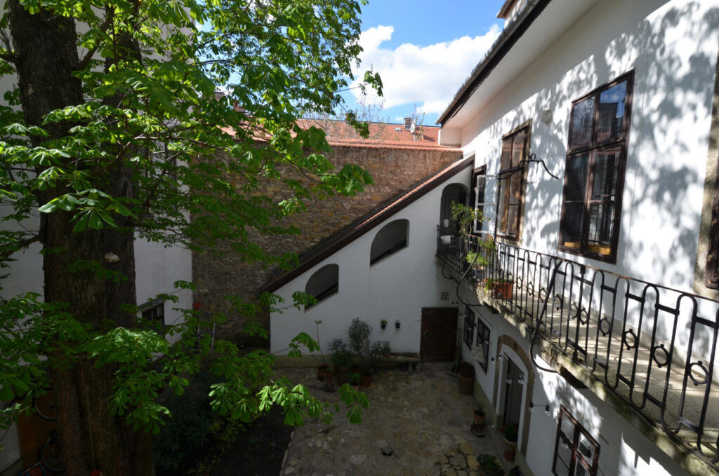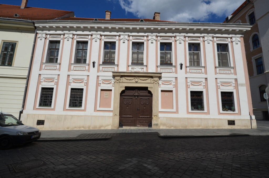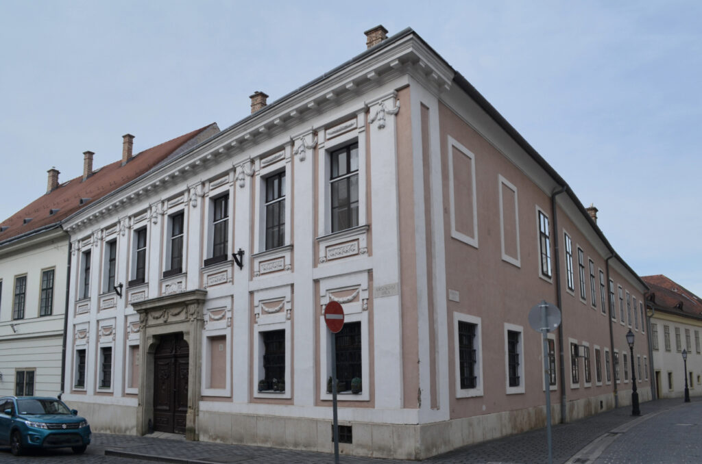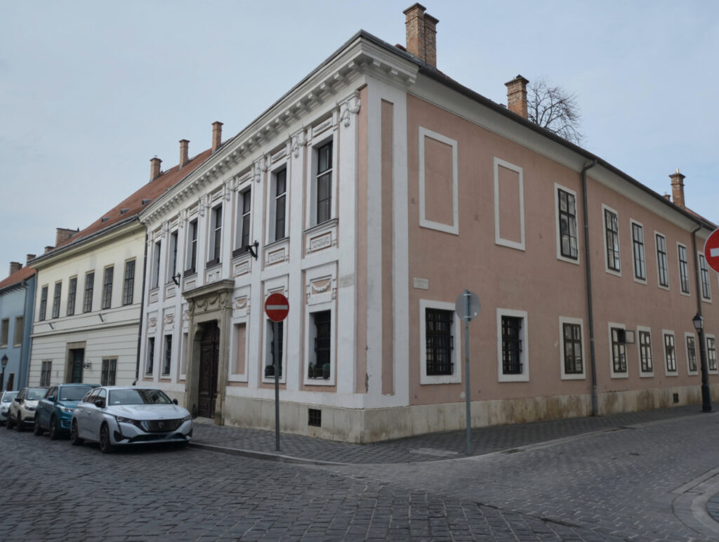 | | | „Az Országház u. 5. sz. épület helyén a[z 1687-ben készült] Haüy-Rabatta-felmérés alapján két lakóház állt. Az 1696-os Zaiger über die Vöstungban szintén két épületről olvashatunk. Az északi épületről azt írja: »Ház a Sütő utcában, homlokzata 5 öl 3/4 láb, hátoldala 4 öl 3 láb, és mindkét oldala 20 öl egyenlő hosszú. Van még valami régi fala és beomlott pincéje. Jelenleg Reütter főkomisszárius és feleségéé.« A déli épületről pedig a következőt olvashatjuk: »Ház a Sütő utcában, a szomszédos kis utcába nyúlik be, homlokzata 4 öl 4 láb, hátoldala 4 öl 3 láb, és mindkét oldala 20 öl egyforma hosszú. Még jó falai, pincéje van.« Tulajdonosként az Összeírás ismét Reütter főkomisszáriust és feleségét jelölte meg. A sarokház udvarán, az északi és a déli oldalon egy-egy lejáró nyílik két középkori pincébe. Feltehetően a visszafoglalás után azonos tulajdonossal rendelkező, két középkori épületnek külön-külön pincéje lehetett, amelyeket a telekegyesítéskor – a barokk újjáépítésnél – márgába vájt folyosóval kötöttek össze.”[5] |
