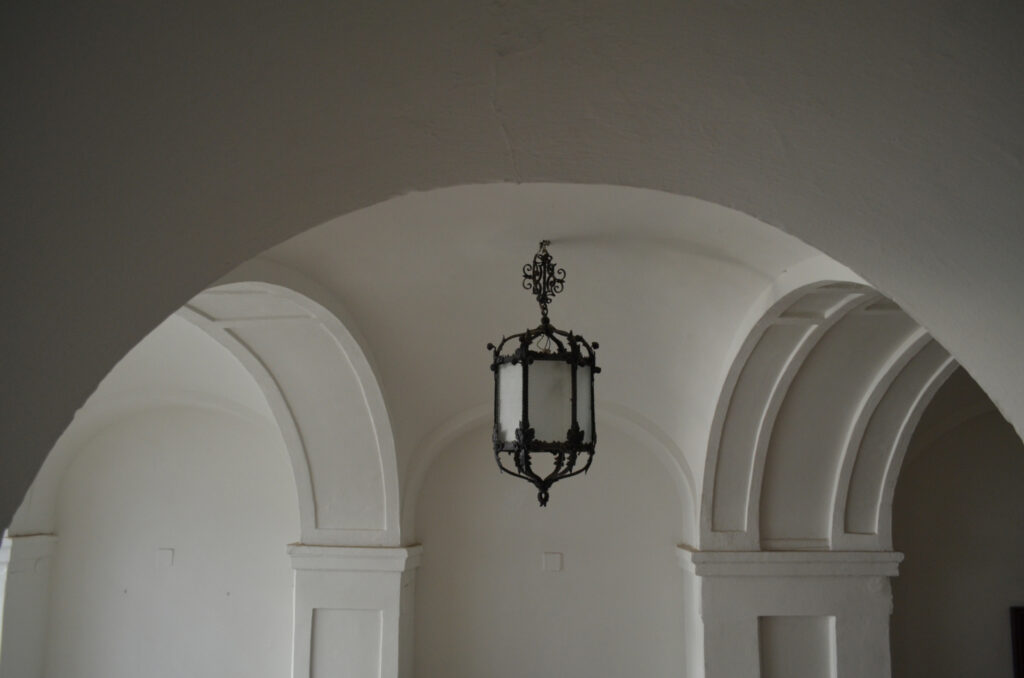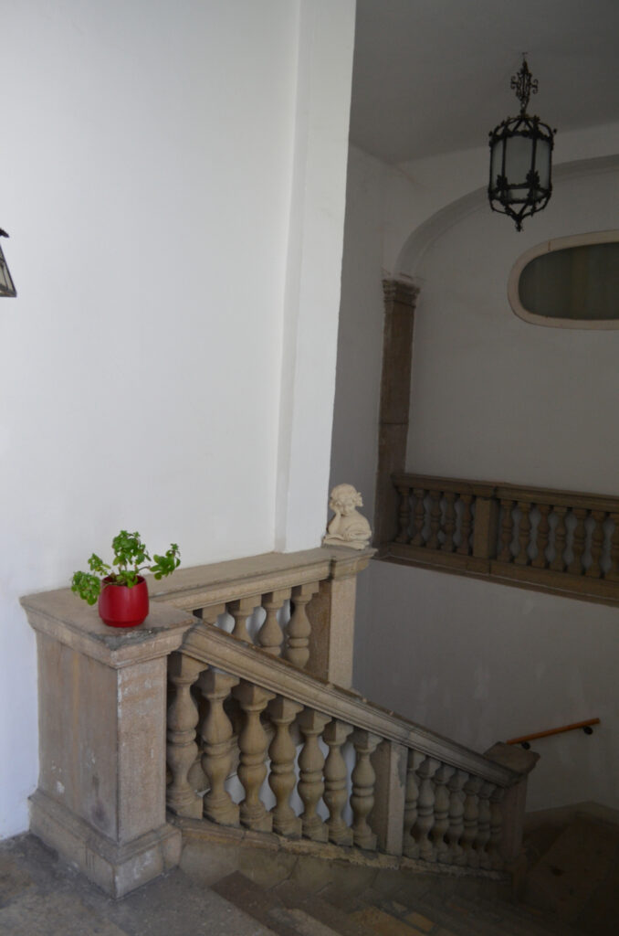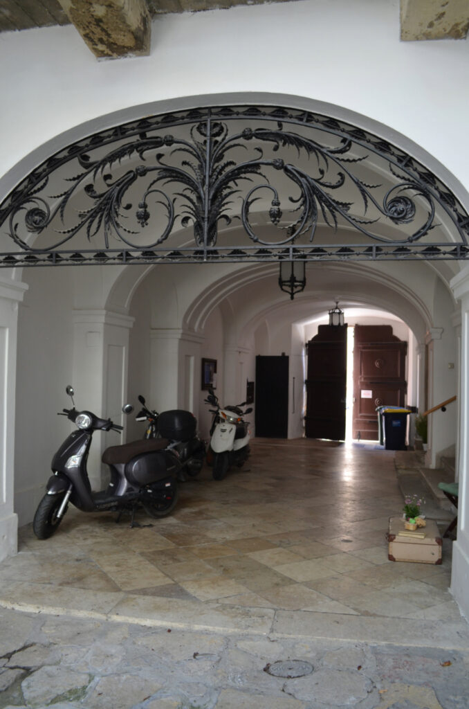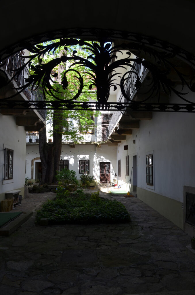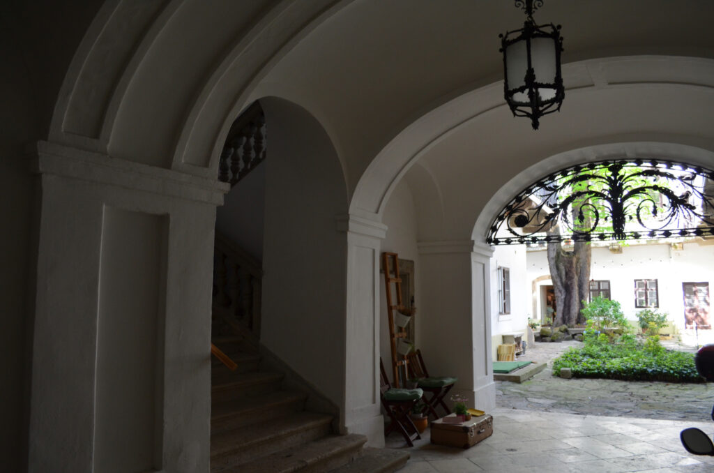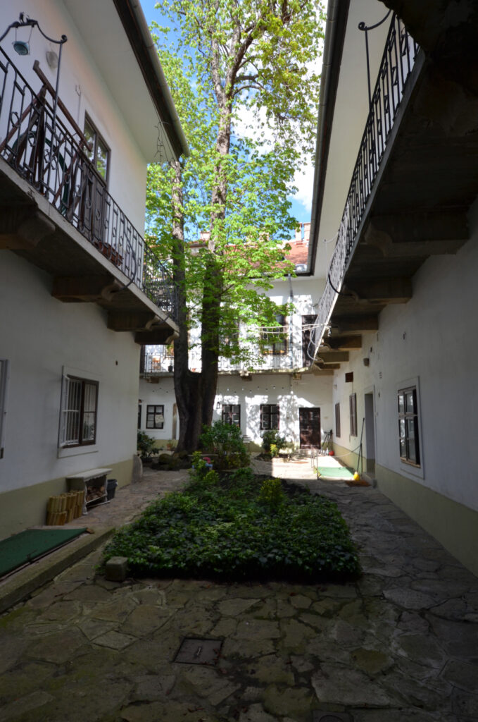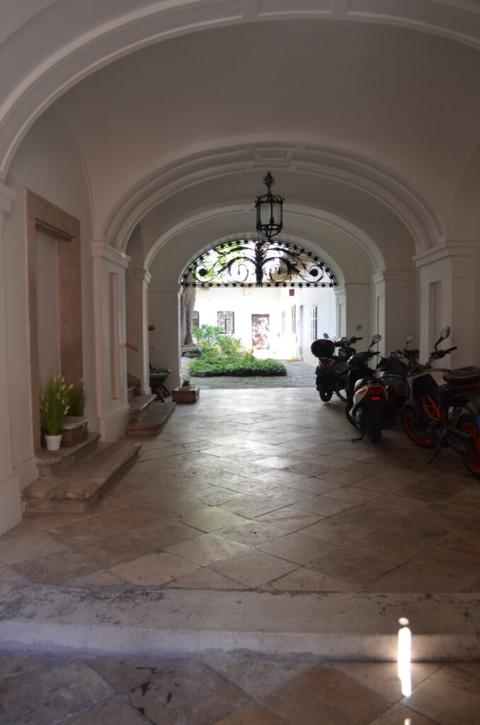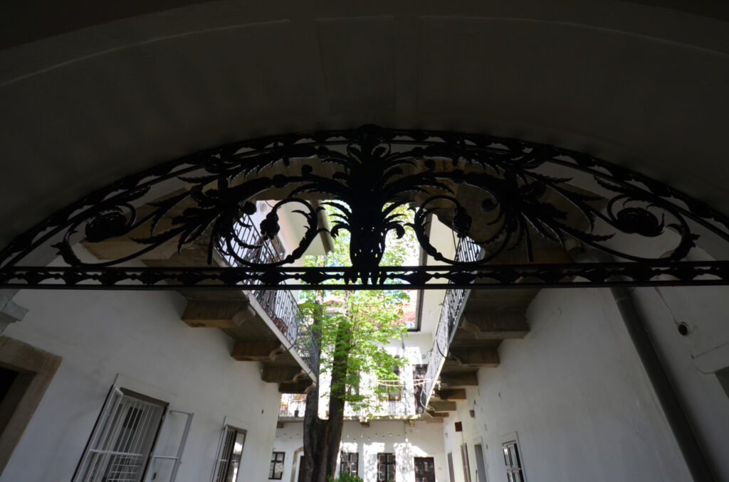 A dúsan díszített, eredeti fakaput mészkőből készült, egyenes záródású, hangsúlyos keret övezi felette füzérdíszes szemöldökfrízzel és profilozott szemöldökpárkánnyal. A kapu két oldalán még a növényi indás öntöttvas kerékvetők is megvannak. A tágas, széles kapualjból neobarokk stílusú lépcsőház indul az északi szárnyban, azaz a bal oldalon. „A boltozat udvar felőli lezárásaként igényesen megmunkált díszkovács rács található.”[4] Az eredeti rács ma a Kiscelli Múzeumban látható, a házban egy másolatot helyeztek el. Az első emeleten függőfolyosó fut végig, copf vaskorláttal. A hátsó udvari szárnyban az emeletre egyenes, fedett lépcső visz fel. Az udvar közepén egy nagy gesztenyefa áll, ami túlnő a házon is.