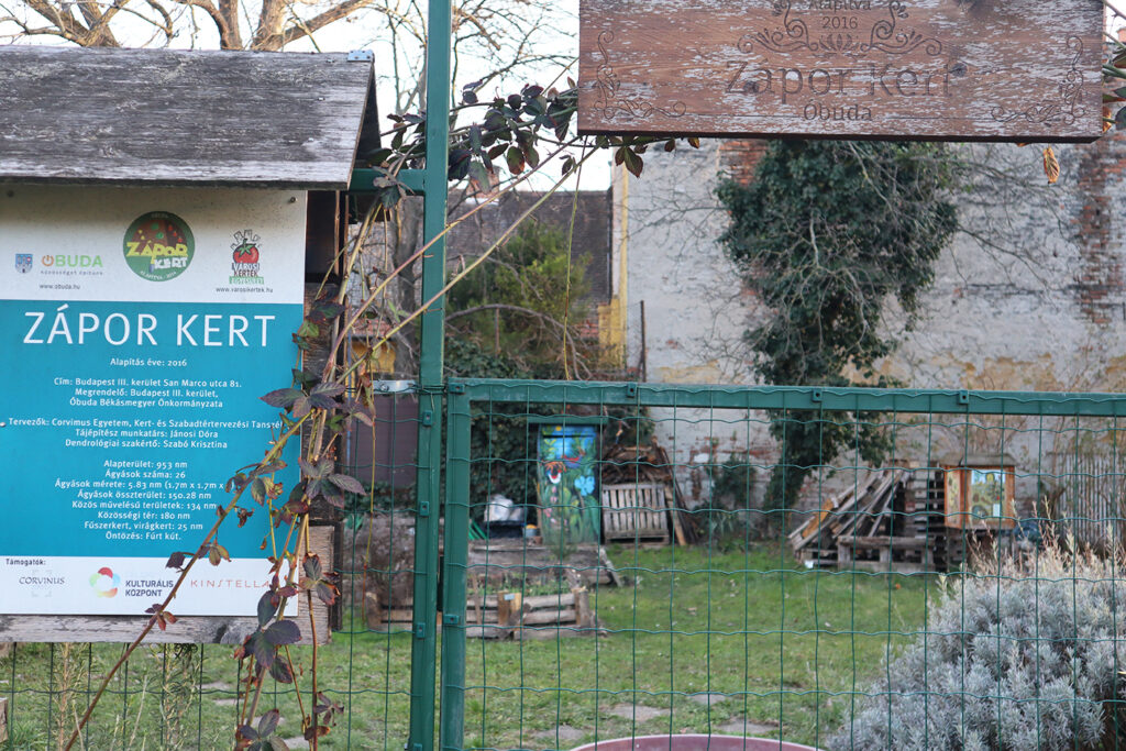 A Zápor Kert 2016 óta működő közösségi kert az Óbudai Kulturális Központ udvarán, 25 ágyással. A saját parcellák mellett közös területeken is zajlik a kertészkedés, ahol mindig valami újjal kísérleteznek a kertészek. Van itt fűszerkert, virágoskert és saját készítésű kerti bútorok is, így nemcsak a növények, hanem a közösség is szépen növekszik.